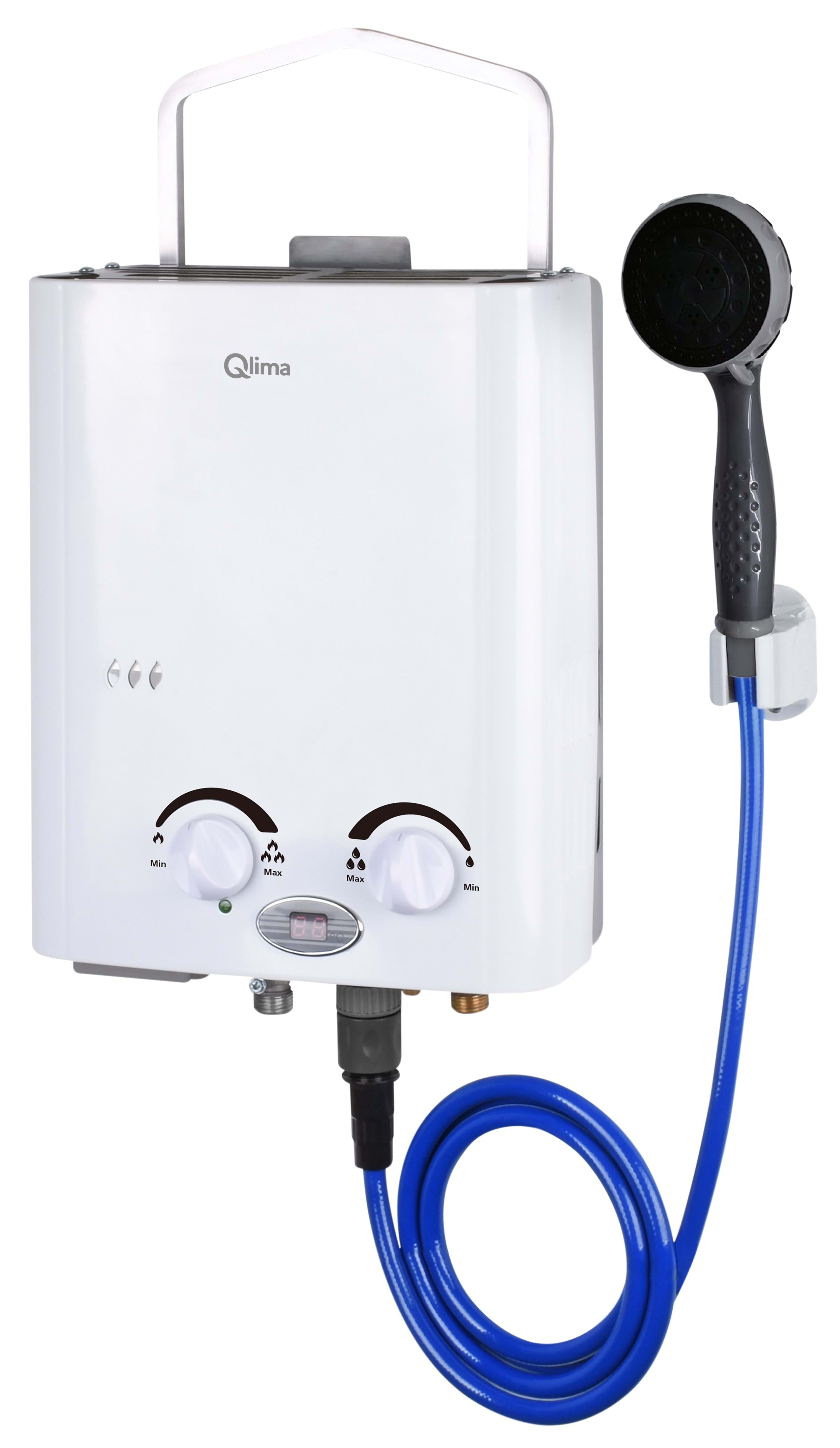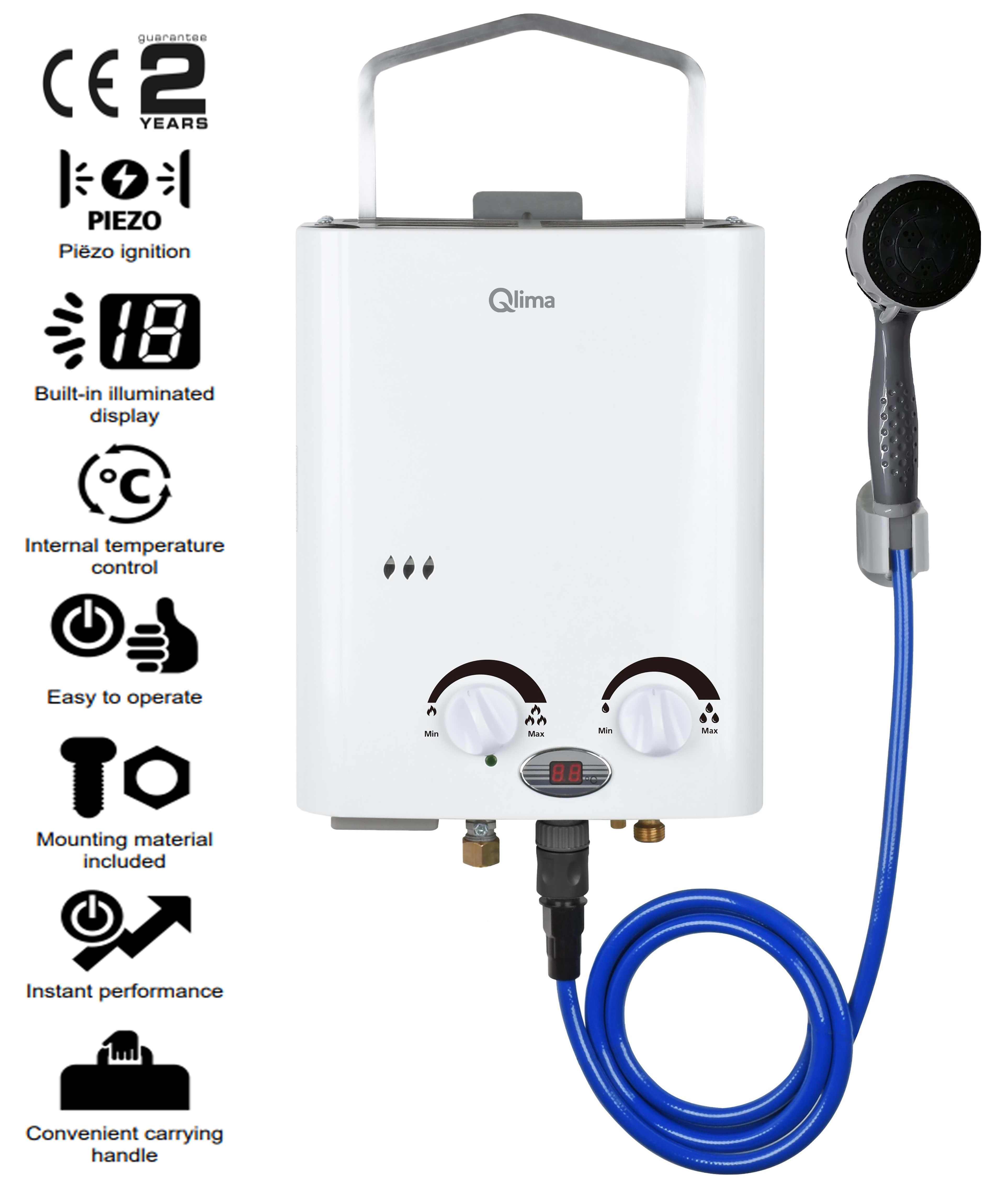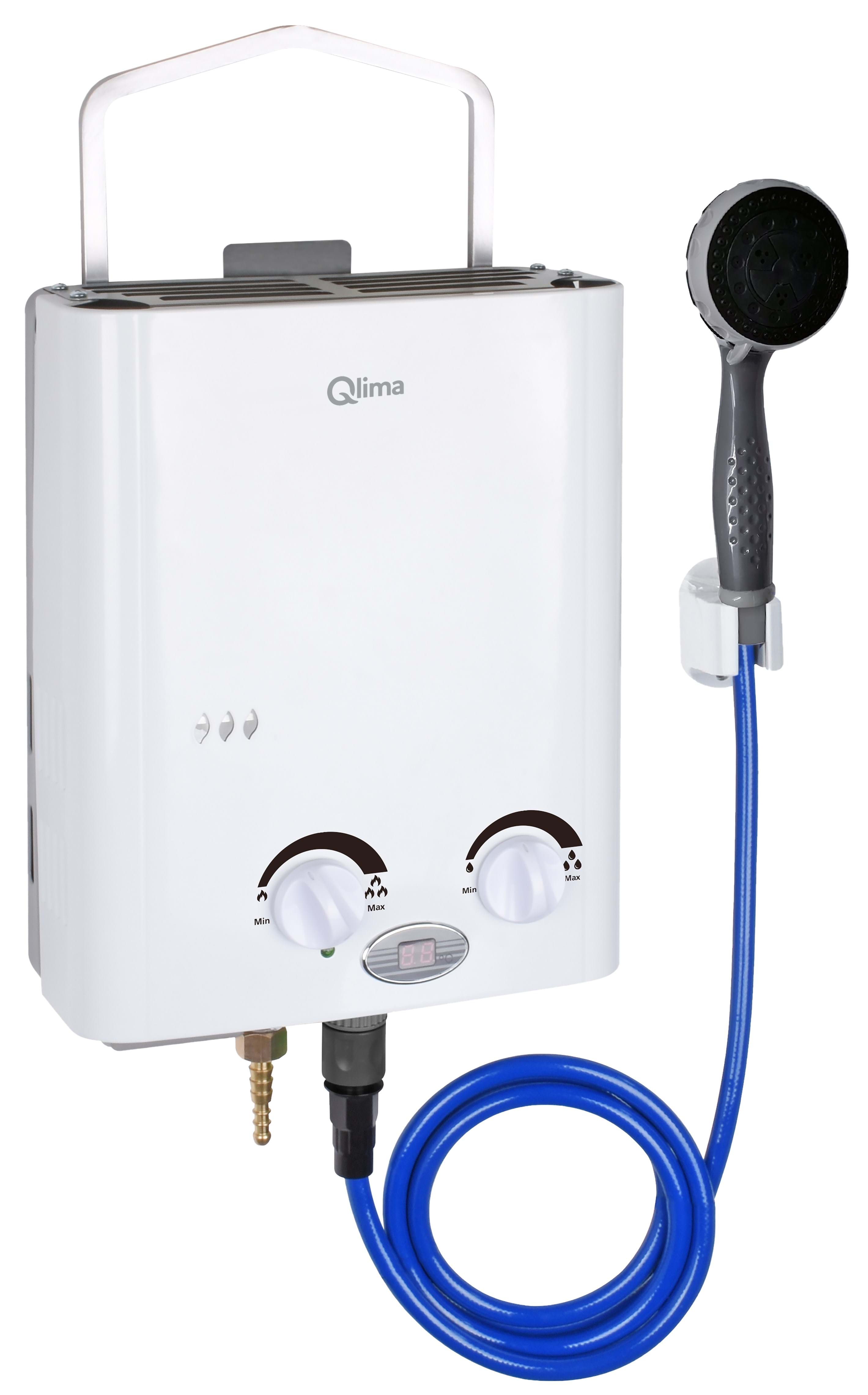 Der Qlima ist für den Außenbereich geeignet. Zum Anschluss des Warmwassergeräts benötigen Sie lediglich eine Wasserleitung und eine Gasflasche. Solang fließendes Wasser da ist, haben Sie warmes Wasser. Das in Gegensatz zu einem Boiler!